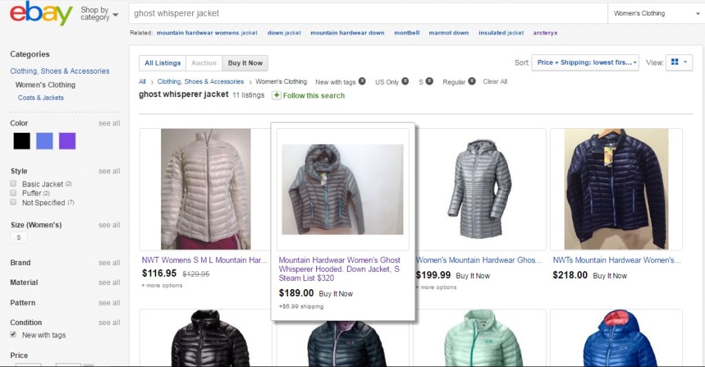 The jacket I purchased had a very descriptive title of “Mountain Hardwear Womens Ghost Whisperer Jacket W/ Hood-Small-Blue,” but in the description options the seller had written “Small” instead of “S” so eBay didn’t recognize it for proper filtering. Any potential buyers who selected a size in the left column never saw this auction.